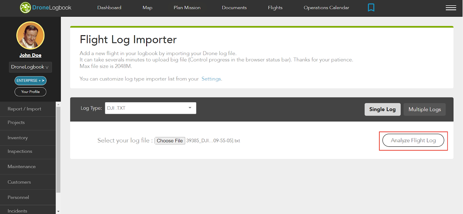 3. Klicken Sie Wählen Sie Datei aus, um Ihre Drohnenprotokolldatei vom System auszuwählen.