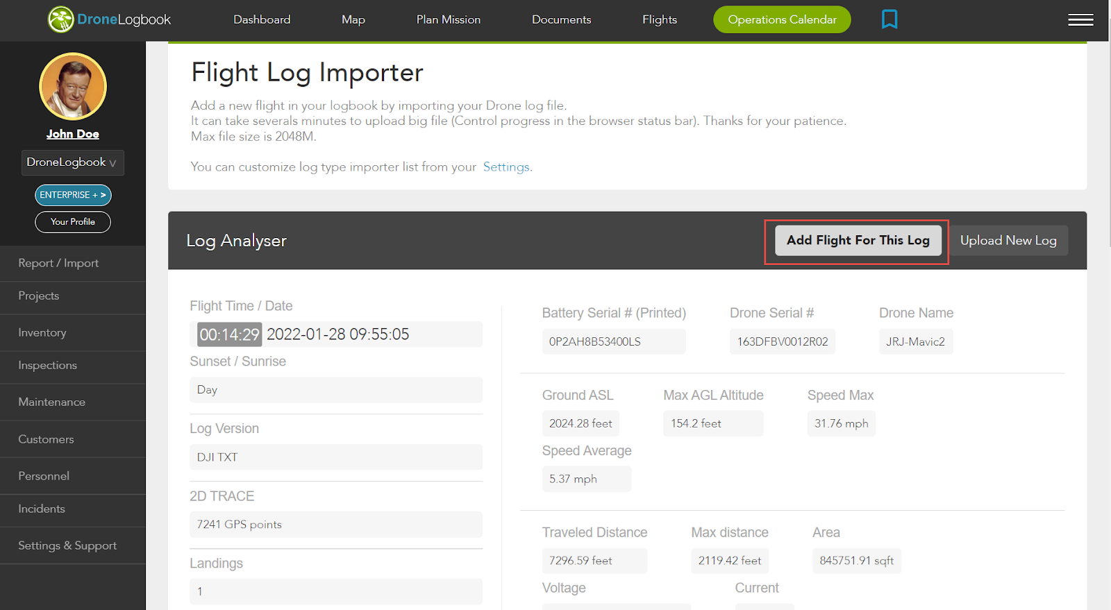 Notiz: Standardmäßig wird der Abschnitt „Einzelprotokoll“ angezeigt, wenn Sie zum ersten Mal auf den Flight Log Importer > Aus Protokolldatei zugreifen.