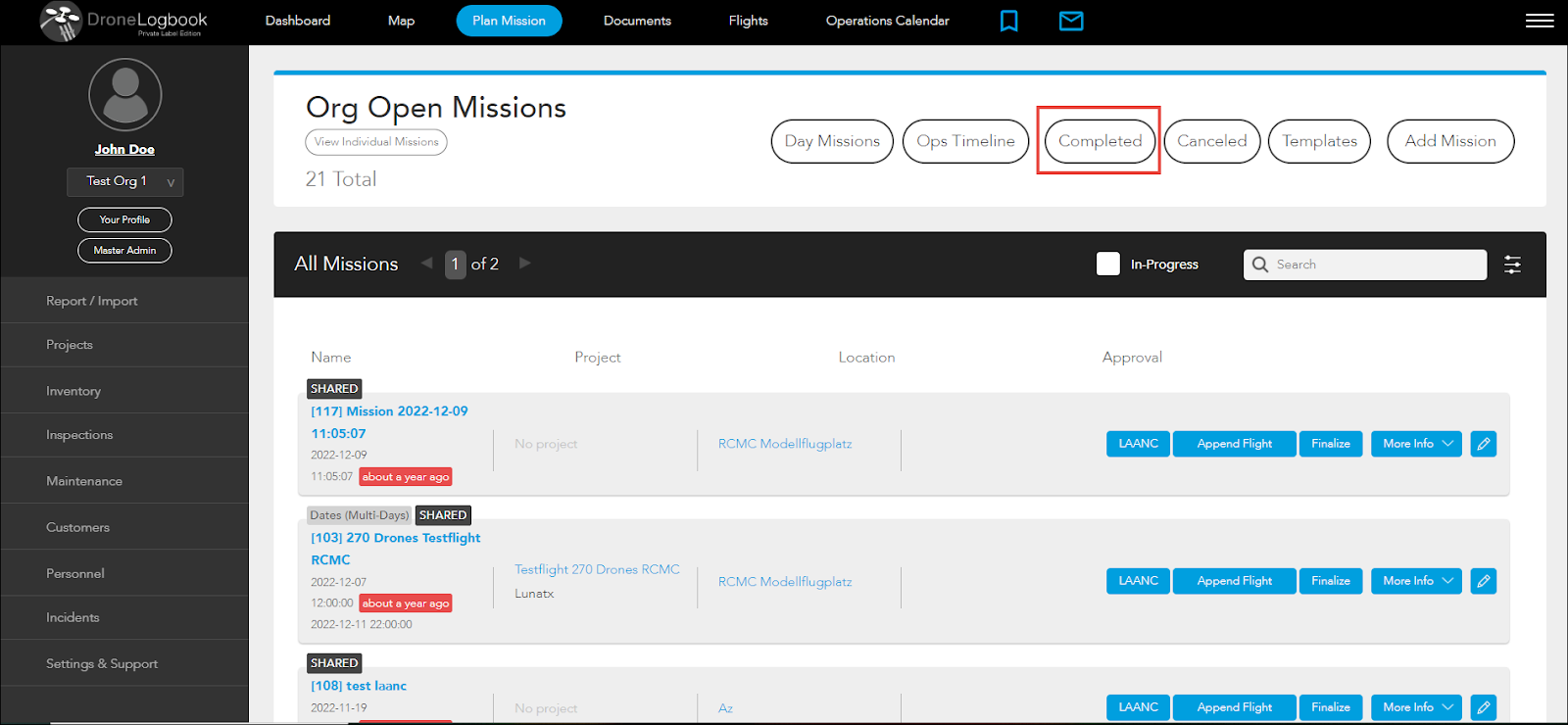 2. Click Completed/ Canceled to archive the completed mission or canceled mission.