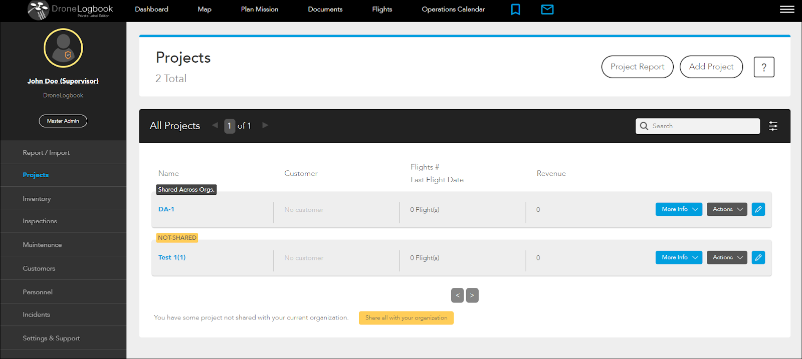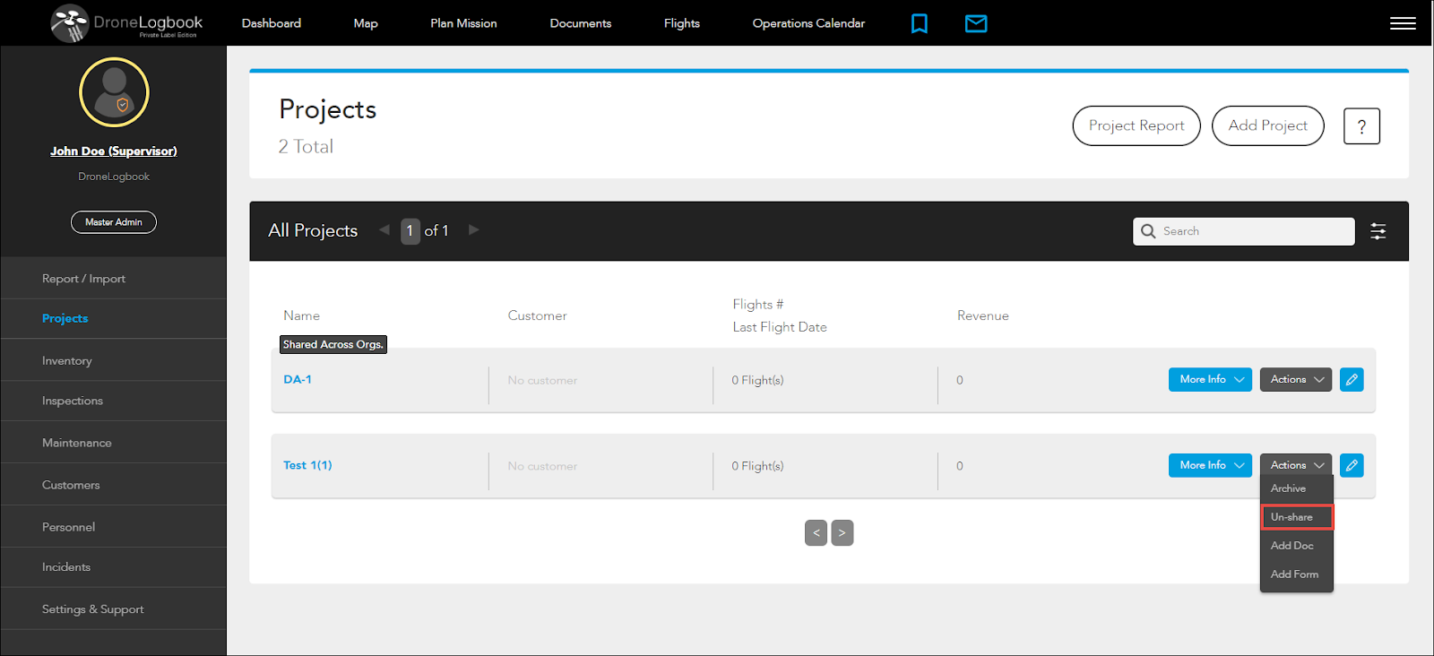 Note: To unshare the project, click Un-share from the Actions dropdown list in the desired project row that is shared and confirm your action.