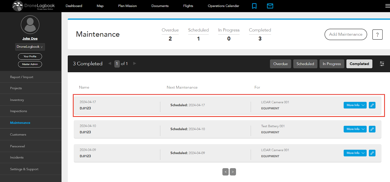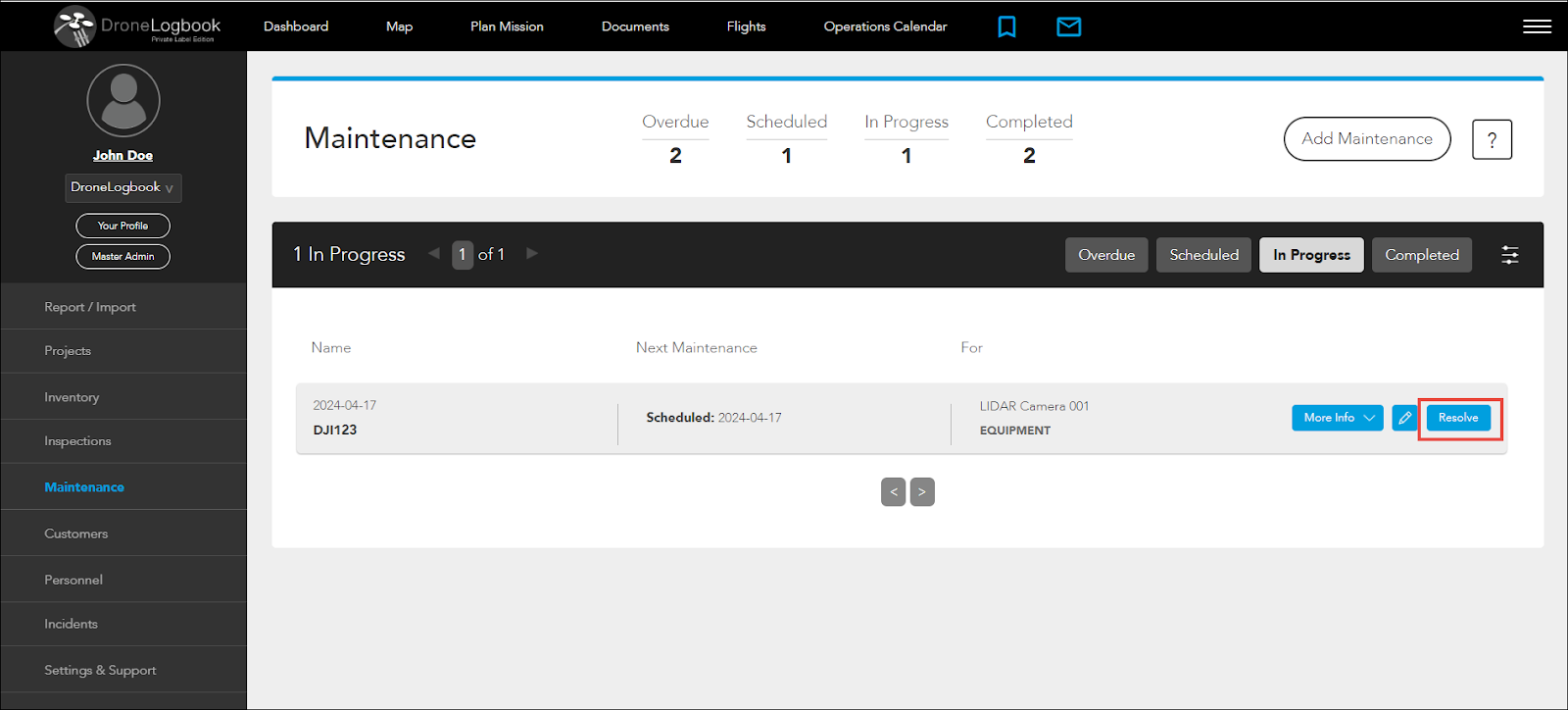 You can resolve maintenance of drones, equipments, or batteries that are scheduled or inprogress by following the steps below.