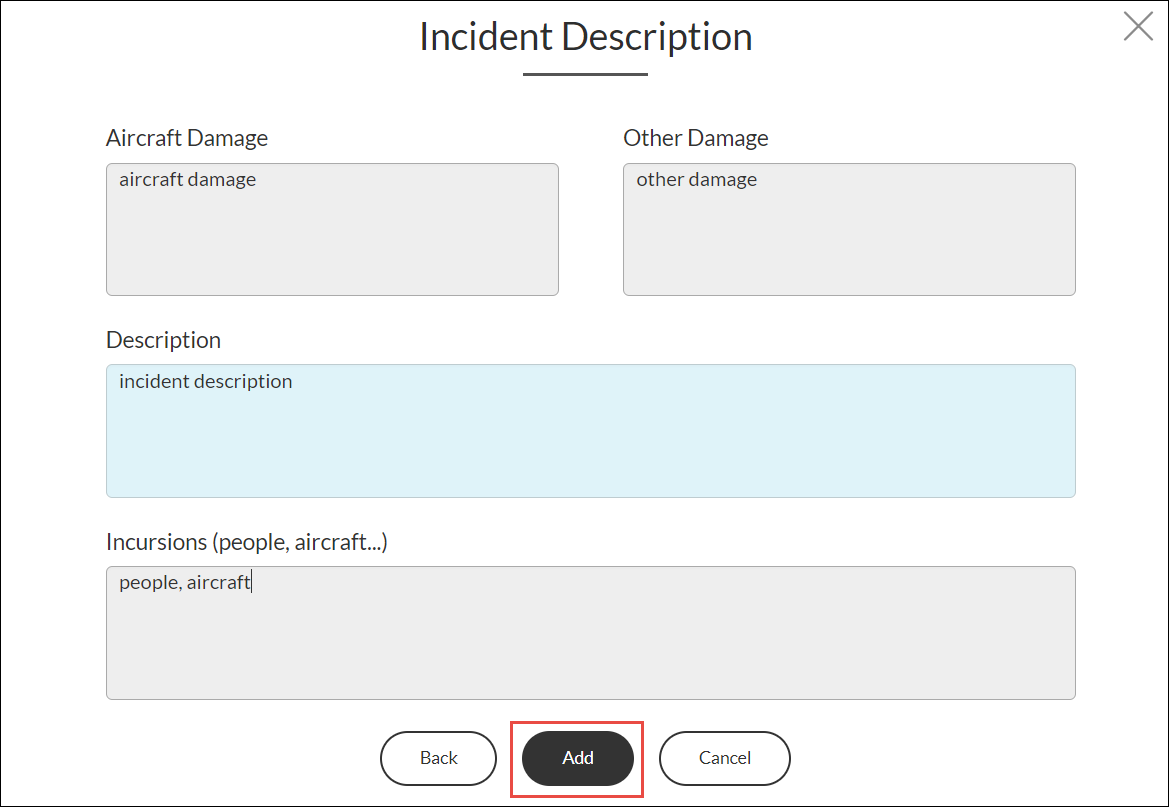El Descripción del incidente se muestra el cuadro de diálogo.