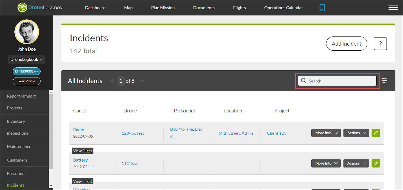 El Incidentes teniendo el carácter o caracteres coincidentes en la Causa, Drone , Personal, Ubicación, o Proyecto columnas en los criterios de búsqueda se muestran