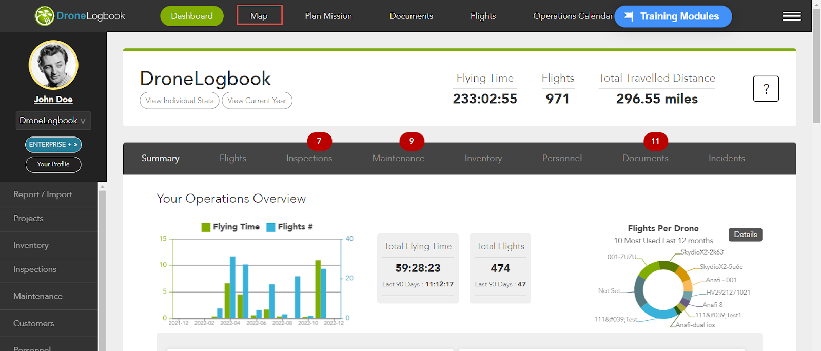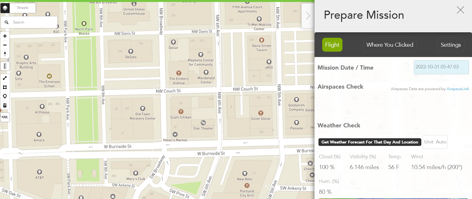 La sección Mapas le permite acceder a datos precisos en tiempo real sobre el espacio aéreo, y el tiempo en una fecha y hora específicas. Esta función es útil mientras planeas una misión. Puede preparar nuevas misiones, editar misiones, o buscar ubicaciones. La página de mapas se puede ver en las vistas de calle, puertas exteriores o satelitales. Puedes acercar o alejar los mapas con herramientas que crean adiciones personalizadas en los mapas según tu misión requerida. Las herramientas disponibles son Herramienta de Distancia, Herramientas de Lineamiento (l), Herramienta de Polígono (p) y Herramienta de Marcador (m).