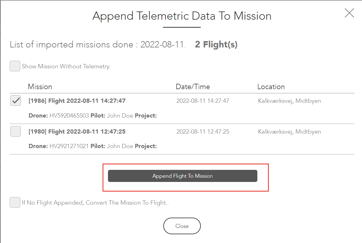 1. Vaya a Misión del plan > clic Anexar de vuelo en la misión que desea adjuntar los datos del vuelo.