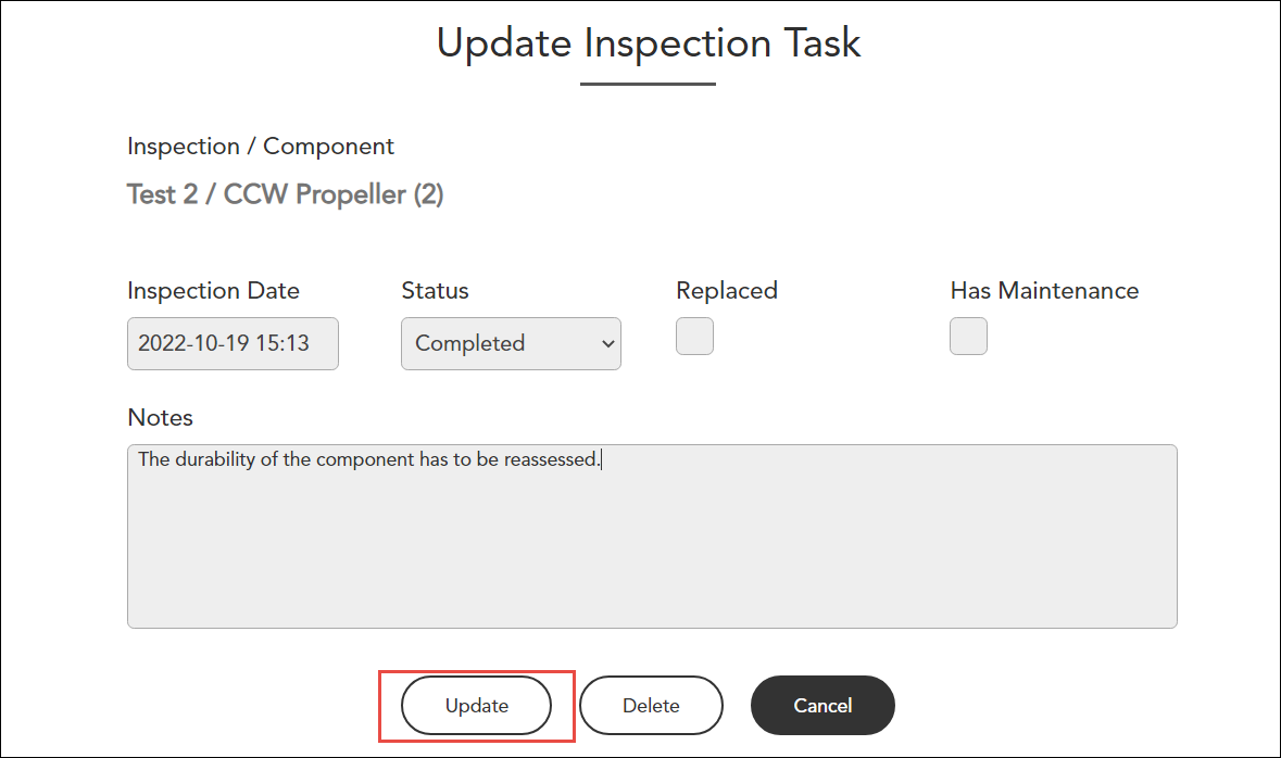 La boîte de dialogue Mise à jour de l'inspection s'affiche.