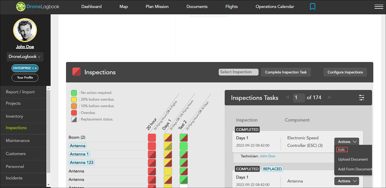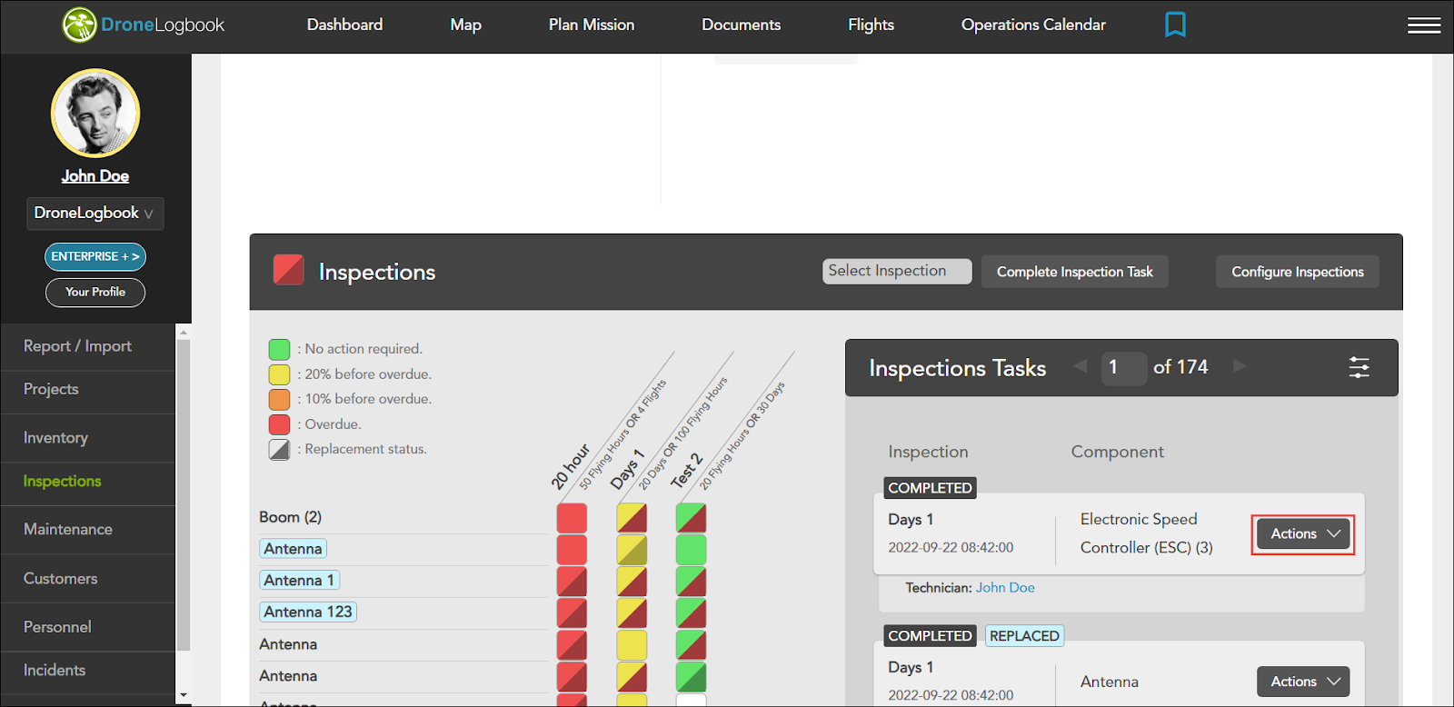 1. Naviguez vers Inspections > cliquez Inspections dans la rangée du drone que vous souhaitez mettre à jour l'inspection.