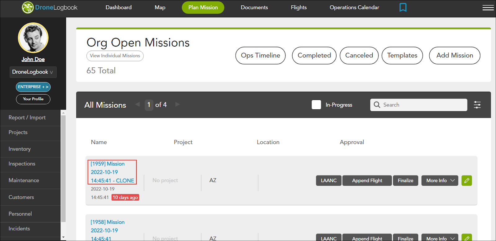 2. Clicca sul nome della missione che desideri esportare l’area di volo.