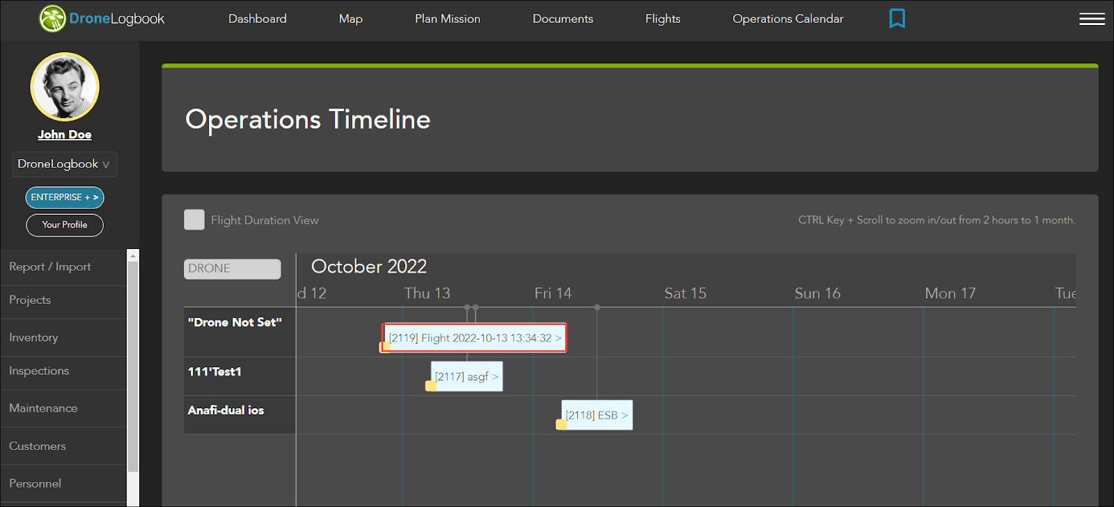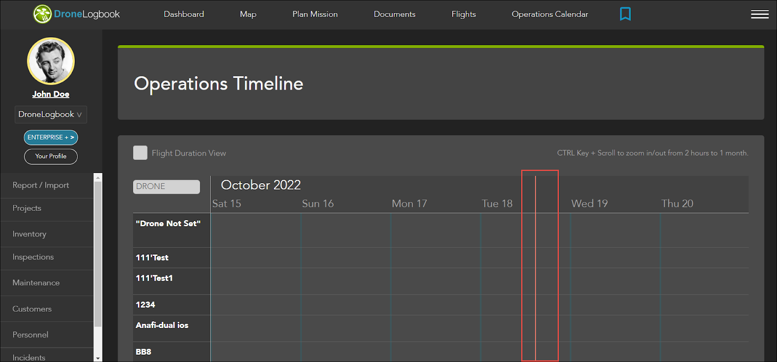 La Ops Timeline ti permette di visualizzare tutte le missioni e i voli su una data specifica o una serie di date attraverso la timeline basata su droni o piloti.