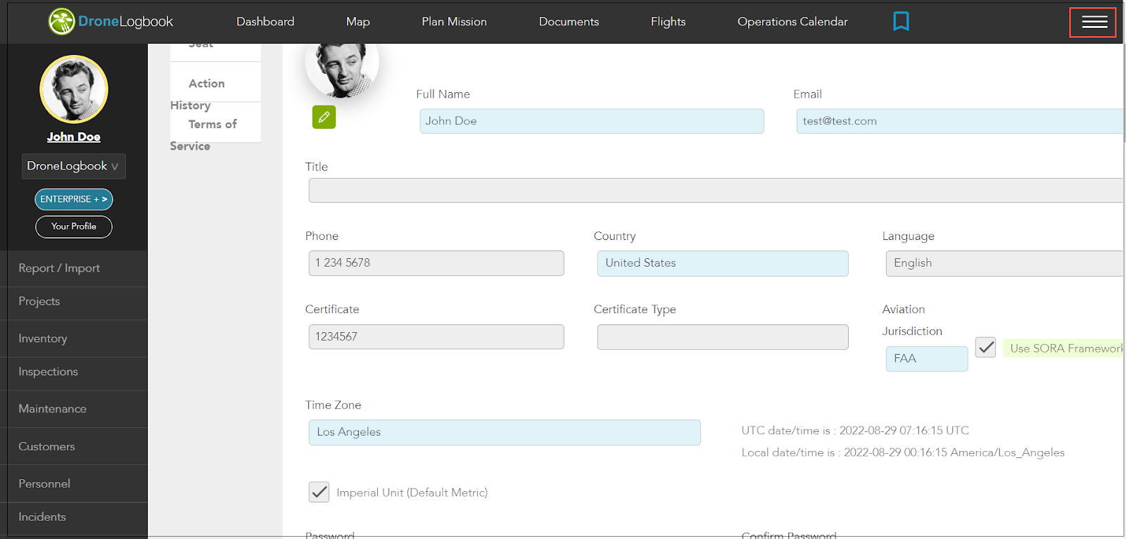 6. Para sair da sua conta DroneLogbook, clique em ícone no canto superior direito da página.
